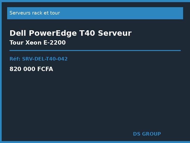 Dell PowerEdge T40 serveur tour entree de gamme silencieux et compact. Intel Xeon E-2224G 8Go ECC SATA controller 3 baies 3.5 pouces LFF port USB 3.0 ports HDMI iDRAC basique. Peut fonctionner sans salle serveur