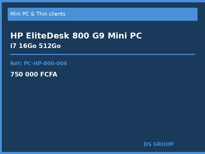 HP EliteDesk 800 G9 Mini puissance maximale dans un format 1 litre. Ideal bureaux exigus. HDMI DisplayPort USB-C Wi-Fi 6E Bluetooth 5.3. HP Wolf Security gestion HP Manageability