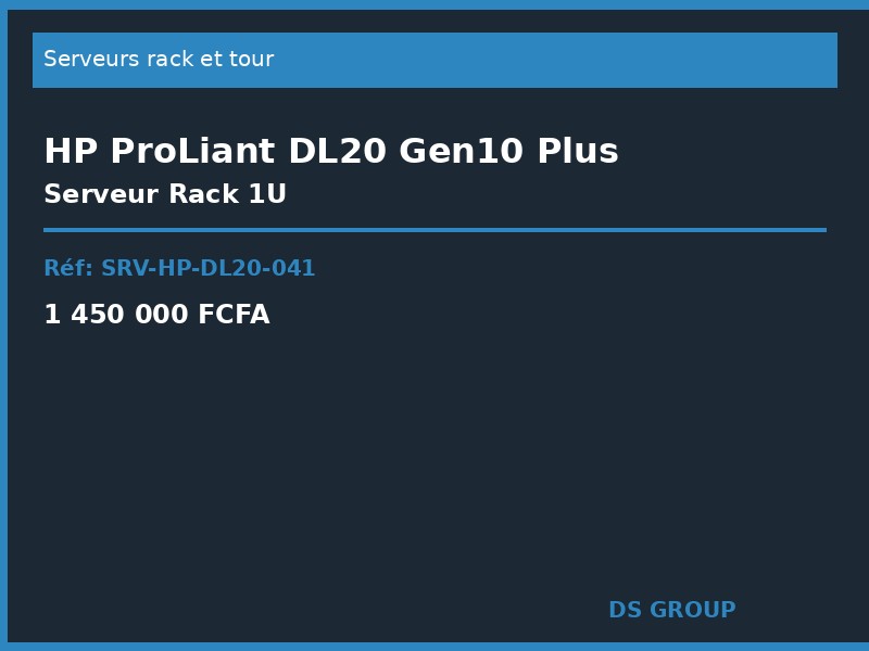 HP ProLiant DL20 Gen10 Plus serveur rack 1U compact pour PME et succursales. Intel Xeon E-2300 ECC UDIMM 4 baies LFF SFF Smart Array P408i-SA iLO 5 gestion distance faible consommation. Ideal Afrique