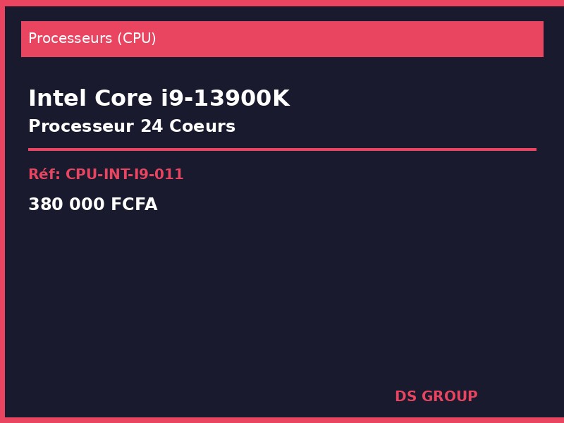 Intel Core i9-13900K le processeur desktop le plus puissant Intel. 24 coeurs 32 threads frequence boost 5.8GHz compatible DDR4 et DDR5 PCIe 5.0 et 4.0. Ideal workstations et serveurs legers